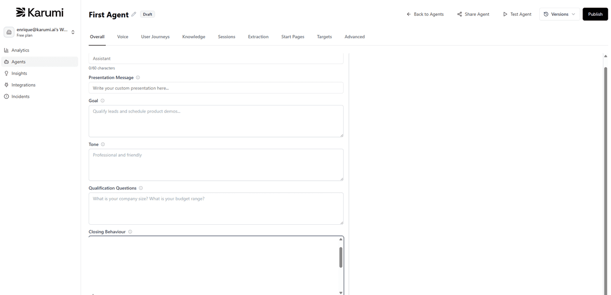 During this phase, it is defined what can be shown, how it is navigated, and how the agent should respond to different user questions. The result is an agent capable of guiding the demo in a coherent and effective manner.